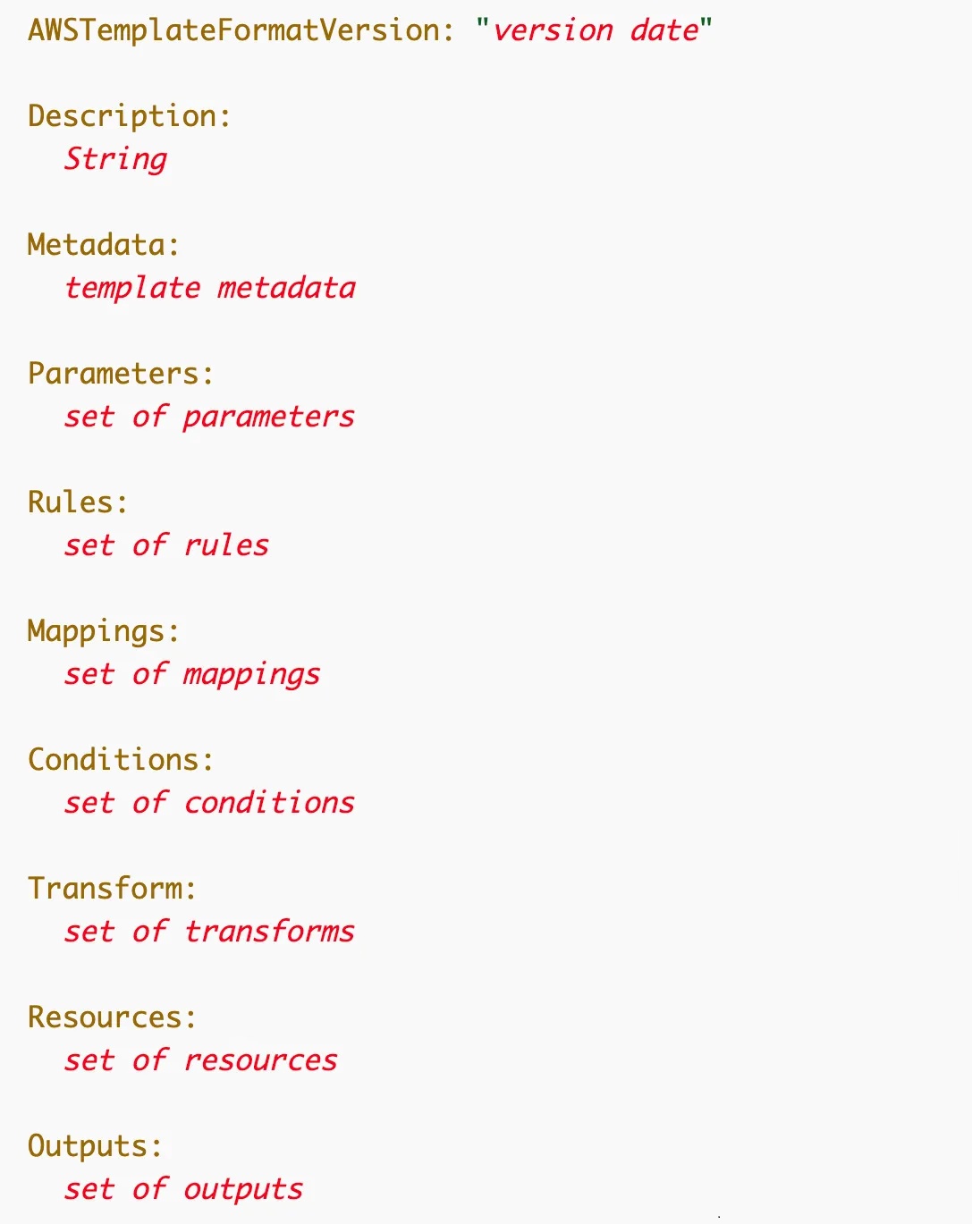 Een Cloudformation-sjabloon heeft een vaste structuur en bestaat uit een versiedatum en maximaal negen secties. Sommige zijn verplicht en de rest is optioneel.