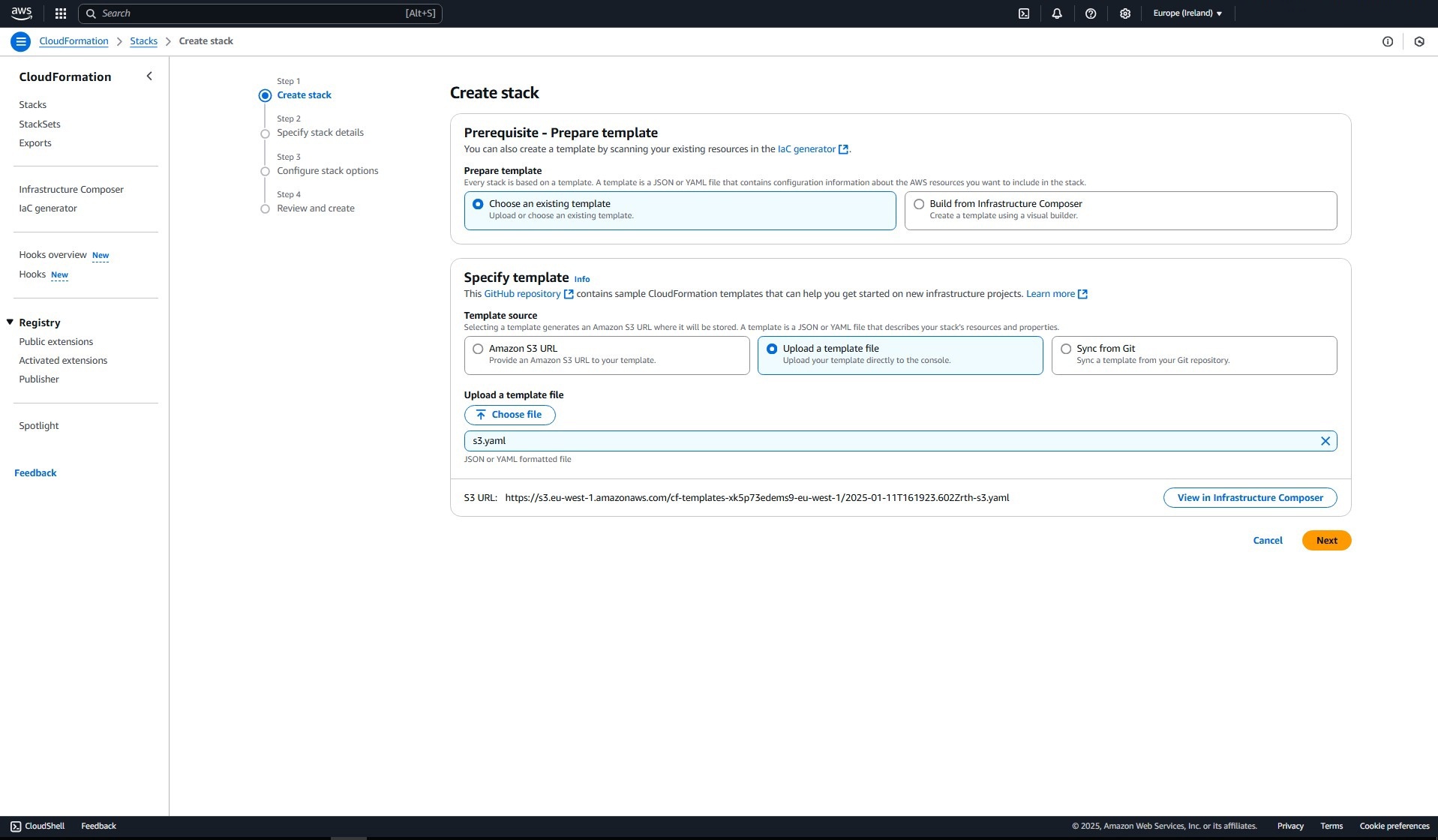 Kies voor een bestaande template en selecteer het bestand s3.yaml. Klik vervolgens op 'Next'.