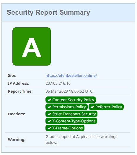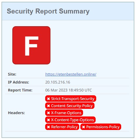 Uit de resultaten van een penetratietest op een applicatie kwam naar voren dat er beveiligingsheaders ontbraken. Het eerste wat je als ontwikkelaar natuurlijk doet is checken of de test wel klopt. Dat kan in dit geval makkelijk via de website securityheaders.com. Helaas liet het resultaat niet veel ruimte voor discussie.