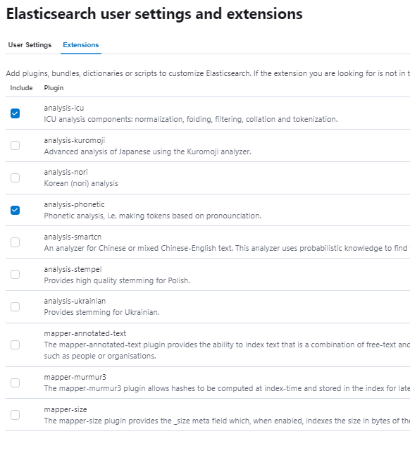 De server is nu gereed. Er moet nog een extra stap worden uitgevoerd om ook gebruik te kunnen maken van een zoekalgoritme op basis van fonetische codes. Daarvoor moeten een tweetal extensies worden geïnstalleerd. Kies in het deployments overzicht voor 'Manage deployment' van de zojuist aangemaakte server. Bewaar nu het endpoint dat bij applicatie ElasticSearch hoort. Deze hebben we later nodig.