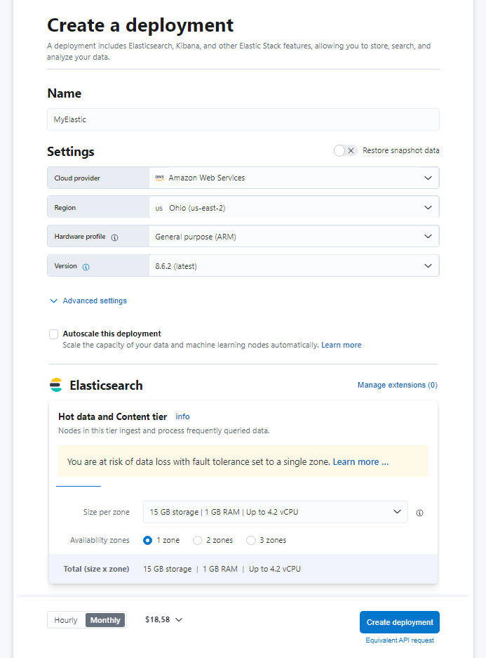 De volgende stap is het aanmaken van een server met ElasticSearch. Kies voor de optie 'Create deployment'. Ik heb gekozen voor de configuratie met de laagste maandelijkse kosten.